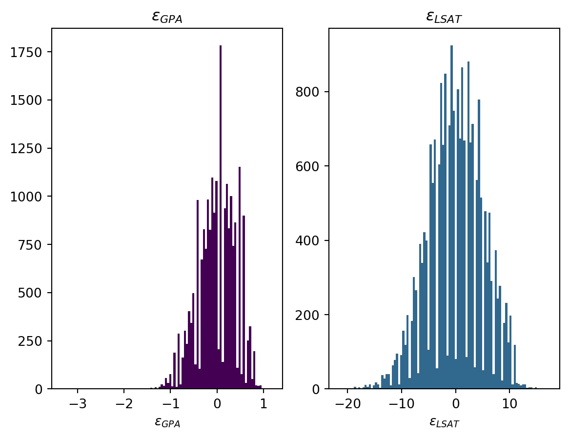 Finally, in Level 3, we model GPA, LSAT, and FYA as continuous variables with additive error terms independent of race and sex (though these error terms may in turn be correlated with one-another).