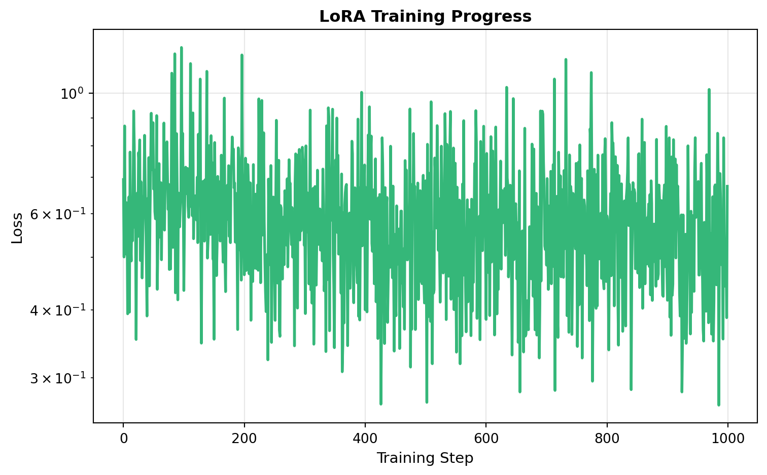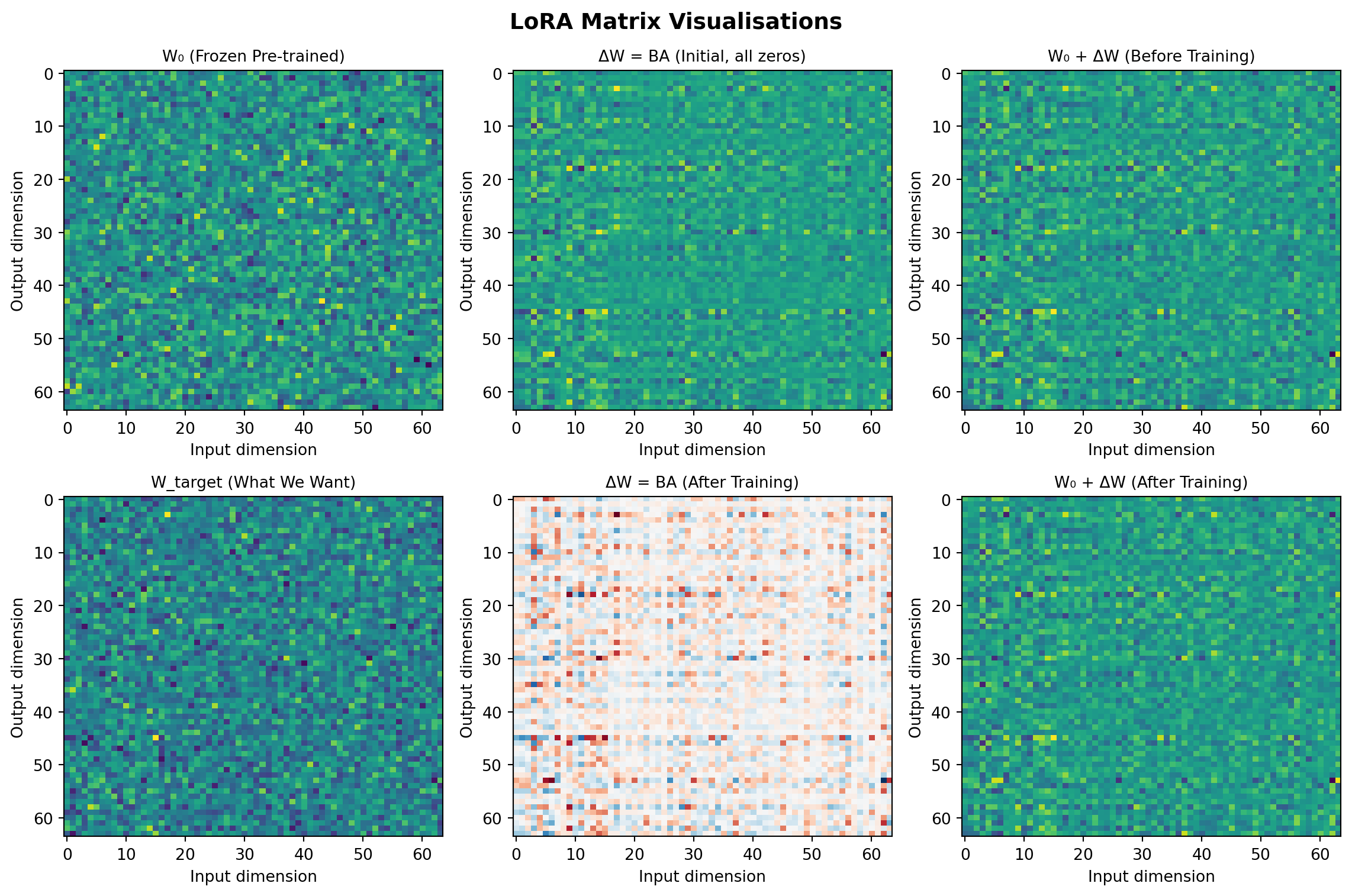 Instead of updating all 589,824 parameters in W_0, LoRA only trains 6,144 parameters in B and A—a 96× reduction! As the demonstration above shows, LoRA can effectively learn task-specific adaptations while using far fewer parameters, making fine-tuning large models feasible on consumer hardware.