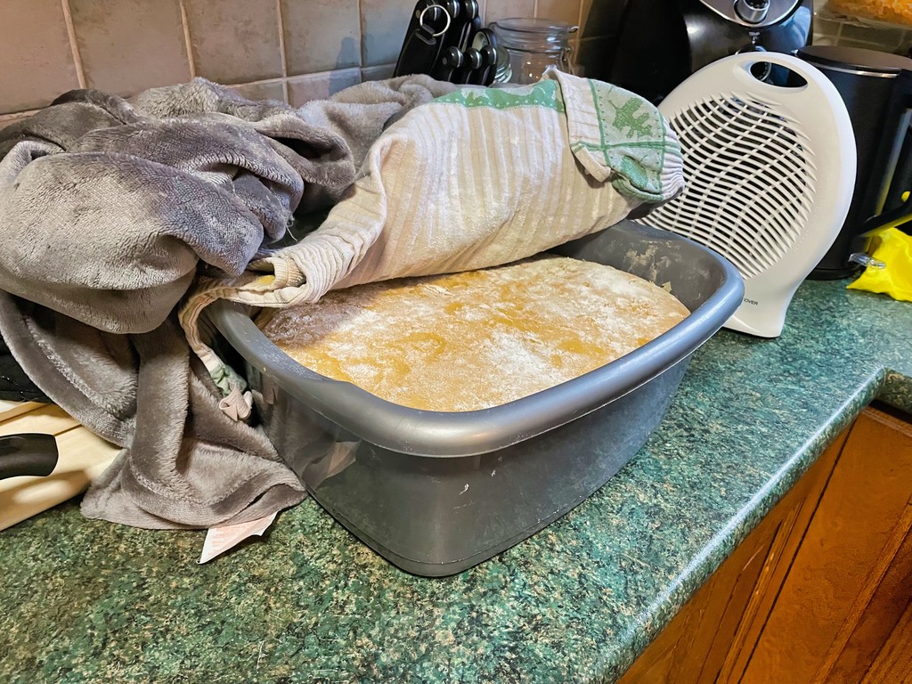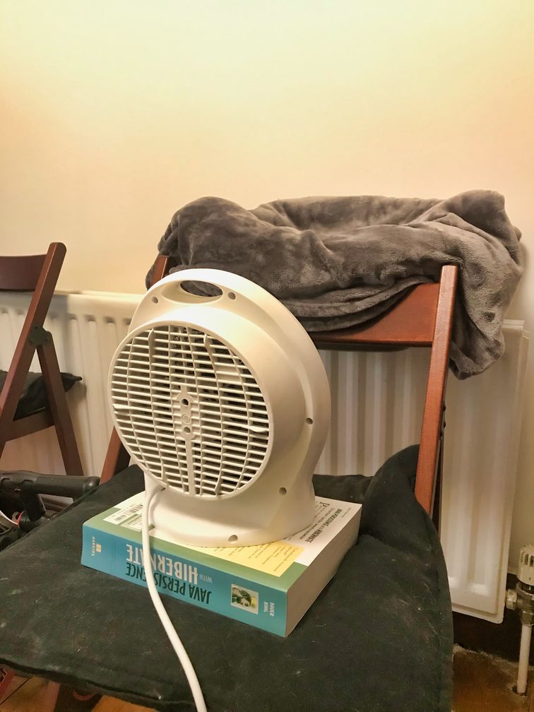 The dough has to be proven at a certain temperature. Here is the contraption we’ve used: a heating fan, heater and an Hibernate (!) book.