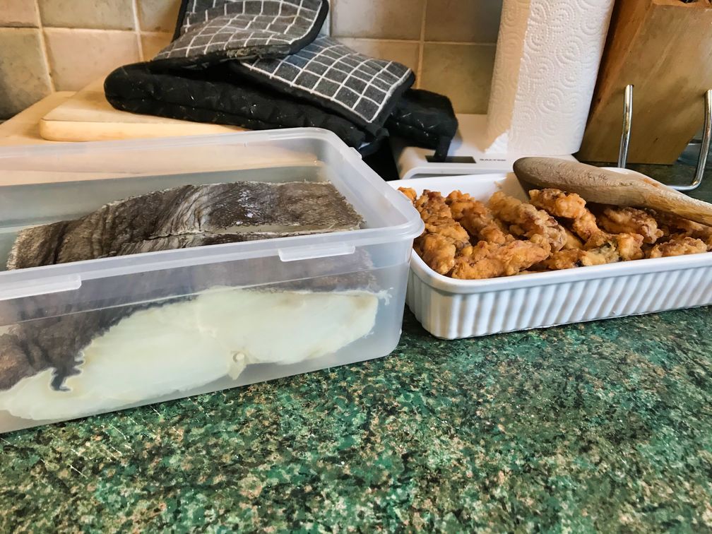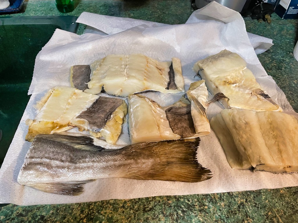 The salted cod needs to be soaked in water for at least four days to remove the excess salt (picture above, on the left).