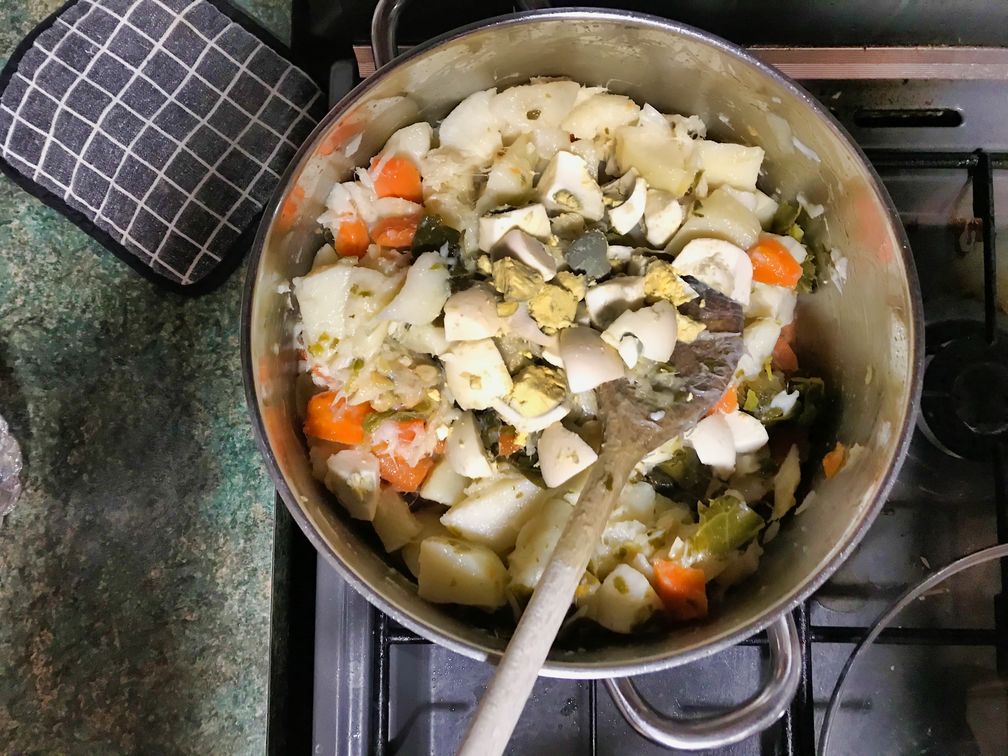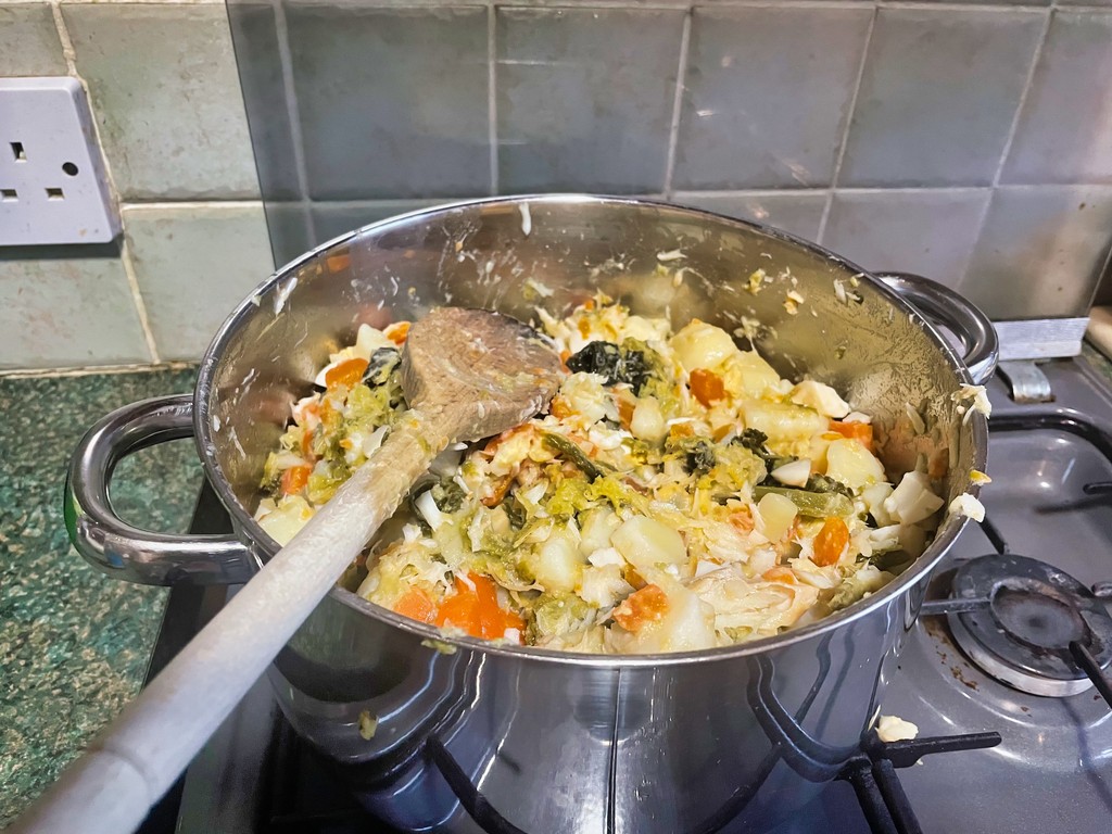 When the garlic is brown we add all the left-overs (potato, sliced egg, carrot, cabbage and shredded code). We stir it for at least 15 minutes and add vinegar. Lots of vinegar.