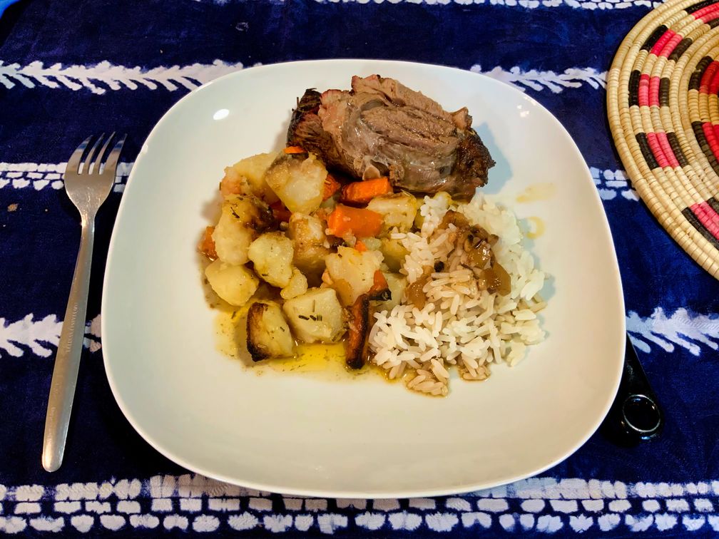 It is accompanied by roast potatoes and carrots and (optionally) some white rice.