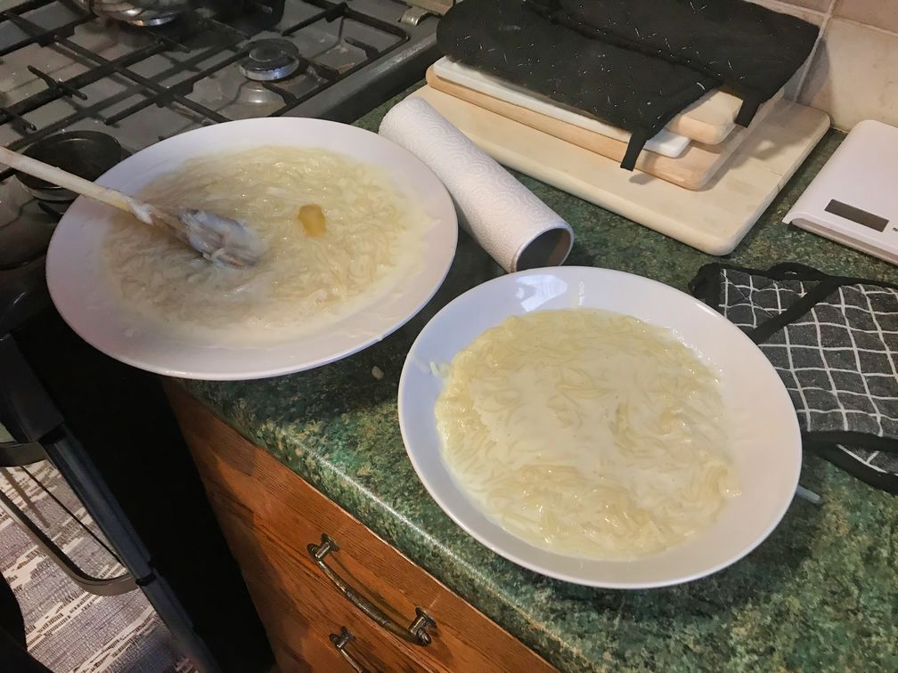 The preparation is quite similar to rice pudding, but adding some lemon peels to the milk mix.