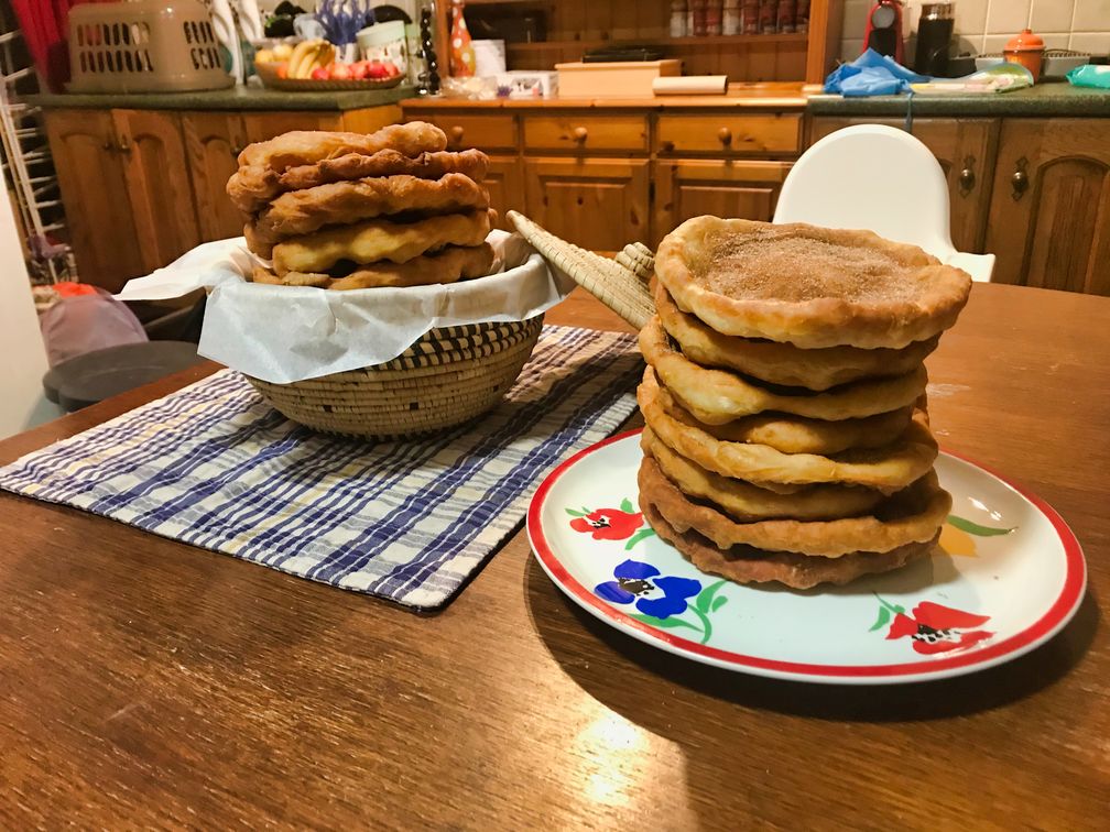 The dough must be proved (in our case at least 10 hours) so it can be stretched and fried lightly in olive oil on both sides. After draining any excess oil, they are sprinkled with a sugar and cinnamon mix.