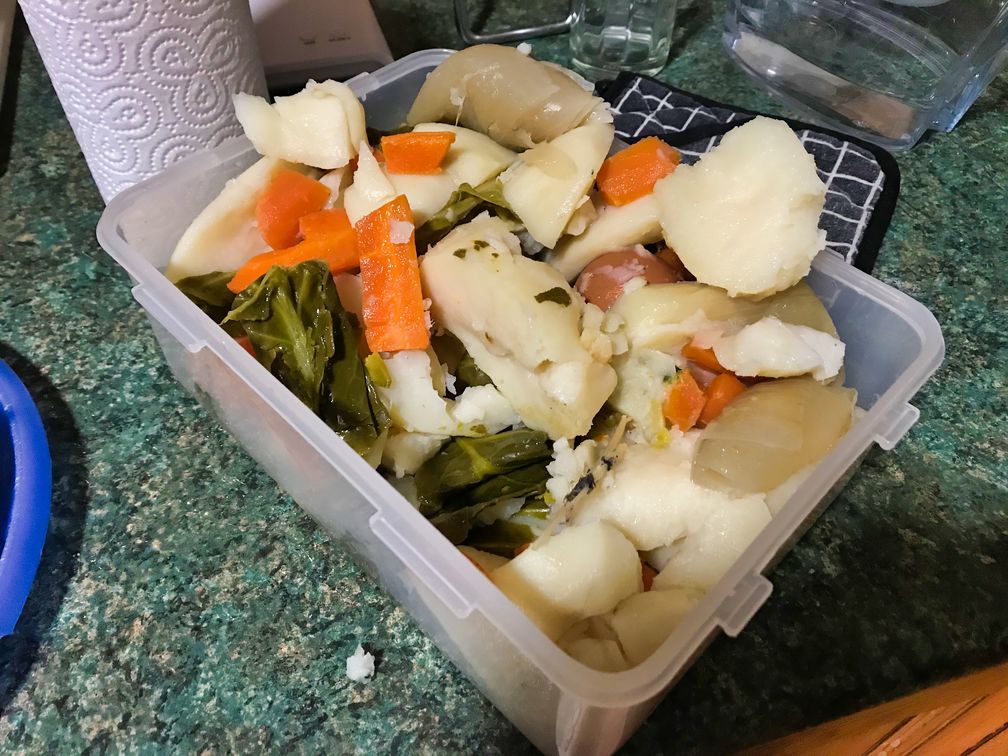 It’s a really simple dish: just put everything on a pot and let it boil for approximately one hour. Since the salted cod has a really firm fleshy texture, it won’t fall apart like fresh fish when boiled for a long time. Usually there’s no need to add salt, since the cod will probably still have quite a lot of salt in it, but it never hurts to double check.