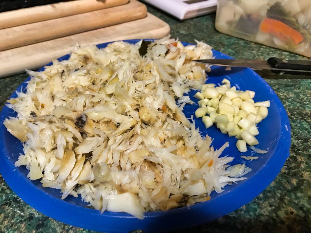 Start by shredding the cooked salted cod and removing all the fish bones and skin.